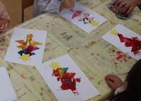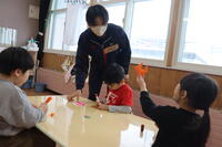 生徒たちは1人1クラスを担当し、それぞれの年齢の発達段階や特徴に応じた企画を事前に計画・準備しました。0歳児にはペットボトルにビーズを入れた手作りおもちゃの制作を、1~2歳児は感触を楽しむフィンガーペイントを、3~4歳児は創造性を育むおりがみ制作を、そして5歳児はルールを学べる整列ゲームを行いました。